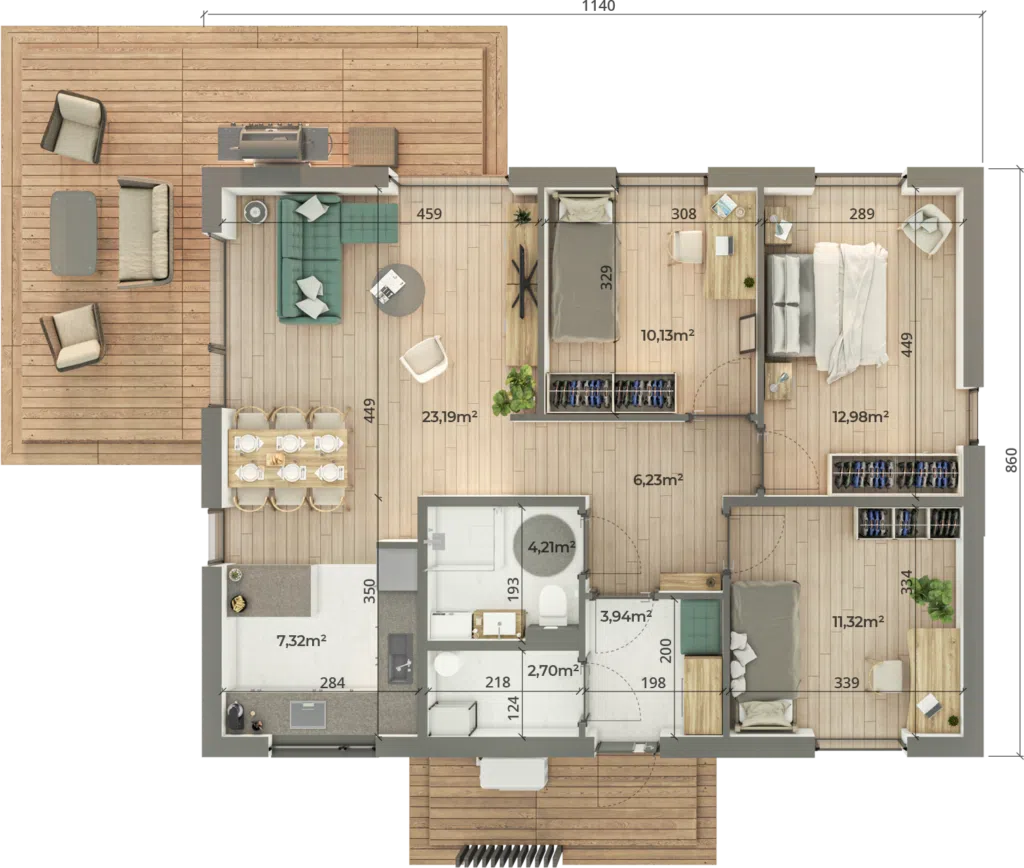 To cut the waiting time and keep quality high, we went for a modular house from Wirex Construction. The model is called Wirex Basic. It offers 82 square metres of internal space, which, if planned well, is enough for a couple or a small family without anyone needing to sleep in the corridor. The design is compact and practical, with a proper layout and a generous terrace for warmer months. Running costs are low thanks to good insulation and modern systems.