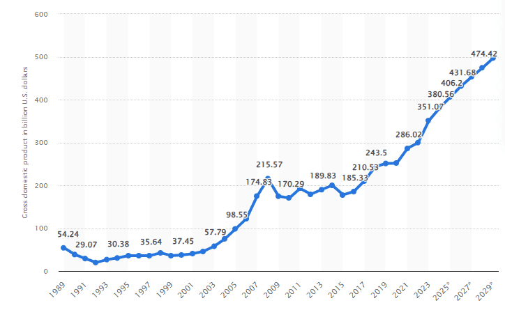 Romania: Gross domestic product (GDP) in current prices from 1989 to 2029 in billion USD